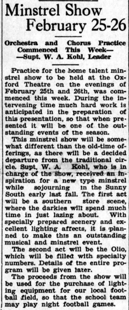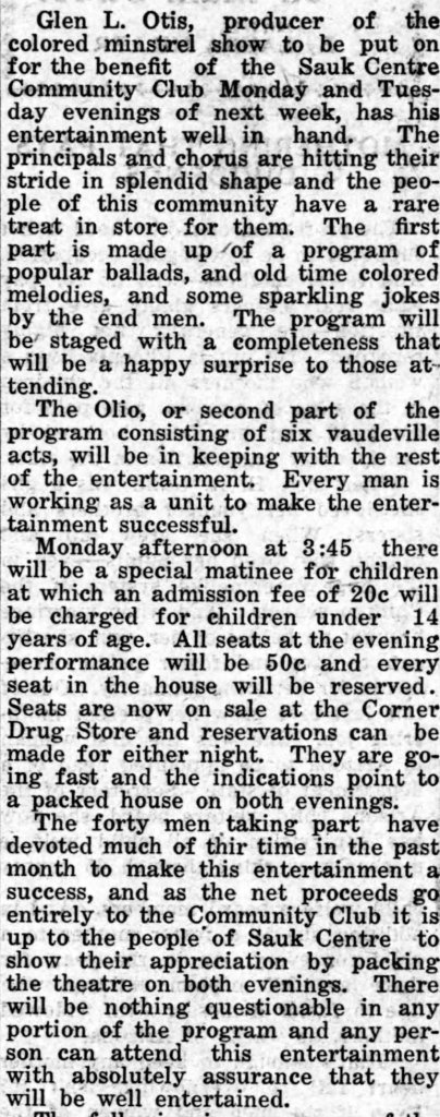 - “Community Club Minstrel Show,” Sauk Centre Herald, Feb. 28, 1924, p. 1. ↩︎