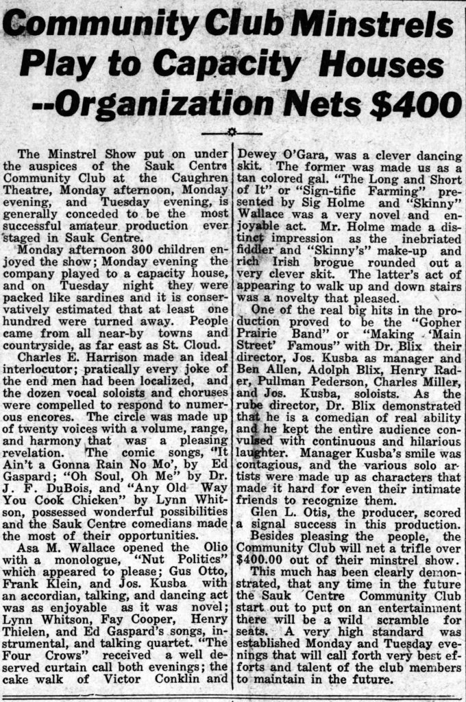 “Community Club Minstrels Play to Capacity Houses–Organization Nets $400,” Sauk Centre Herald, March 6, 1924, p. 1