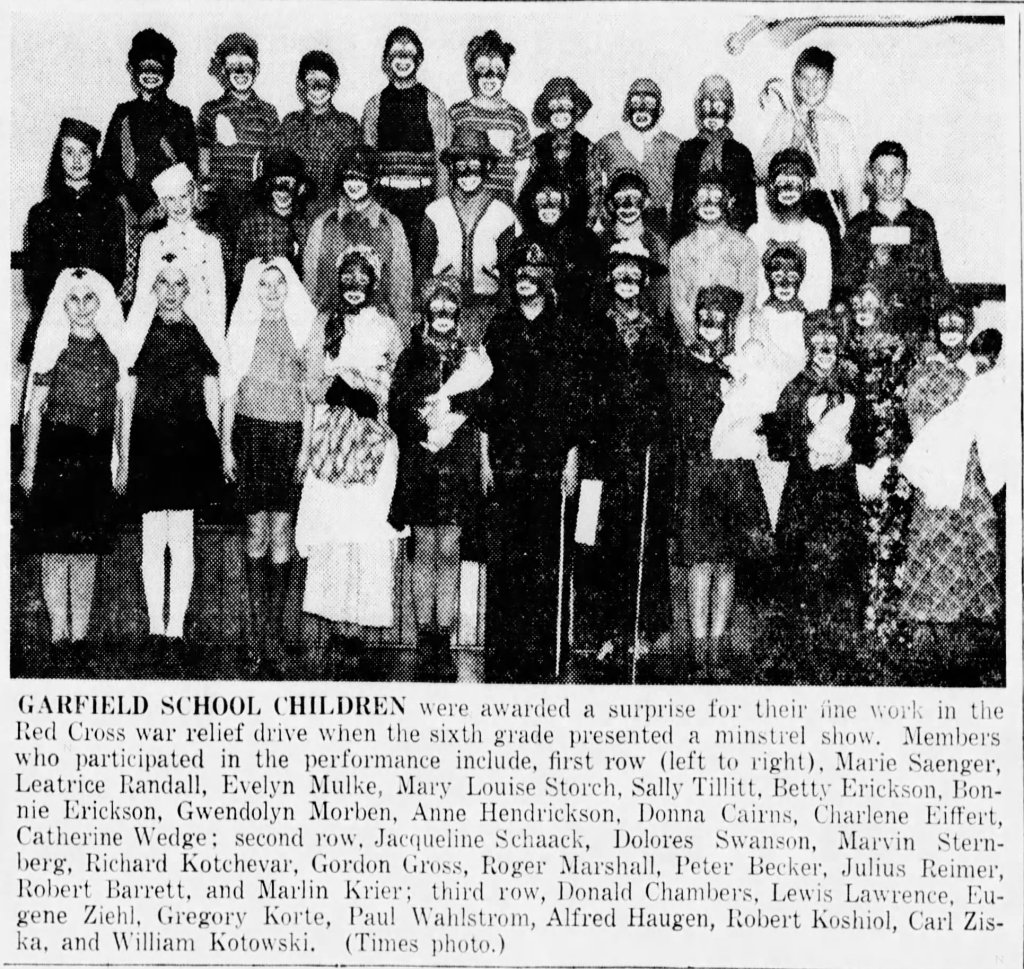 - “C.H.S Juniors in Jambouree,” St. Cloud Times, Apr. 21, 1933, p. 4; “Garfield Stages Red Cross Drive,” St. Cloud Times, Feb. 04, 1942, p. 4; “Fifth Grade at Washington Entertains,” St. Cloud Times, Apr. 20, 1942, p. 6; “Halftime Blackface Minstrel Show,” St. Cloud Times, Dec. 20, 1947, p. 8. ↩︎