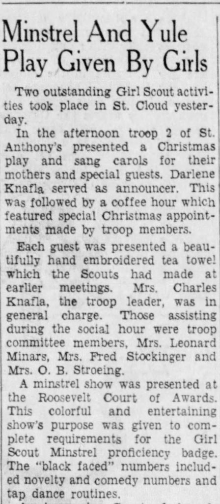 “Minstrel and Yule Play Given by Girls,” St. Cloud Times, December 10, 1953, p. 8