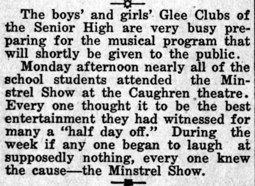 - “Com. Club Meeting,” Sauk Centre Herald, June 4, 1931, p. 8; “C.H.S Juniors in Jamboree,” St. Cloud Times, April 21, 1933, p. 4; “Committees Named for Minstrel Show,” St. Cloud Times, October 26, 1934, p. 9; “Becker PTA to Give Minstrel Show at High School Tonight,” St. Cloud Times, May 5, 1950, p. 8; “Minstrel Show at Sauk Rapids,” St. Cloud Times, February 17, 1939, p. 3. ↩︎