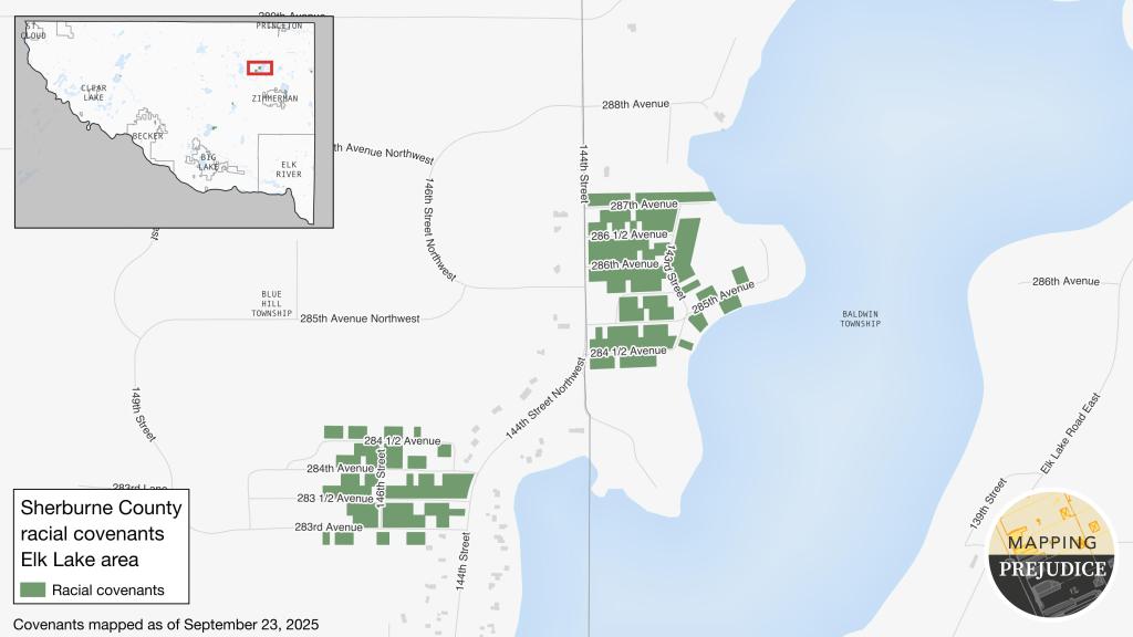 Maps for Sherburne County are now complete, documenting 356 properties with racial covenants across seven neighborhoods. An interactive map, complete with the covenanted language for each property, is available on the Mapping Prejudice website.